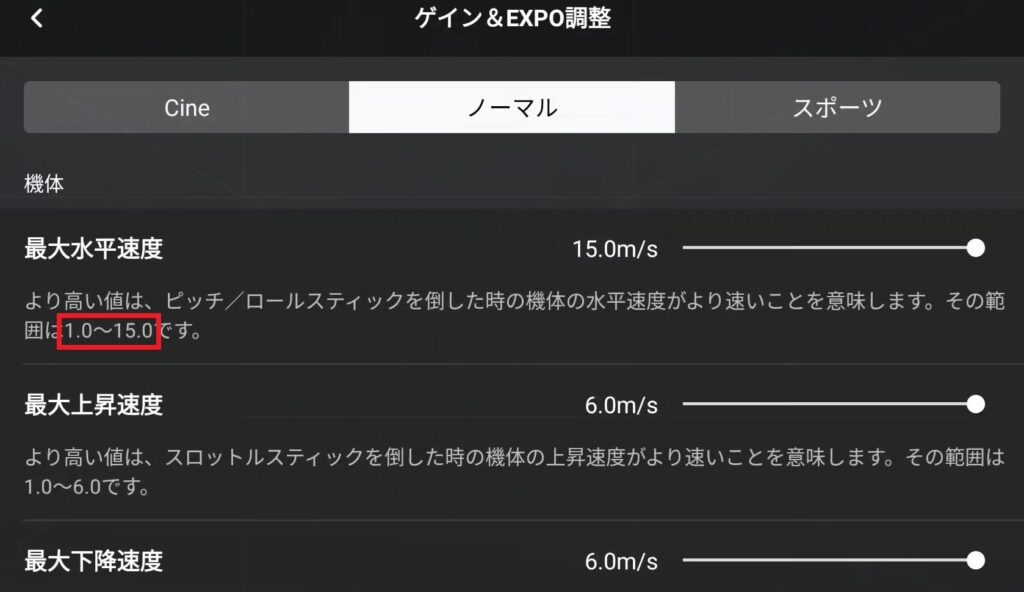 ゲインもEXPOと同様に、フライトモードごとに設定することができます。たとえば、ノーマルモードとスポーツモードの設定画面はこんな感じです。