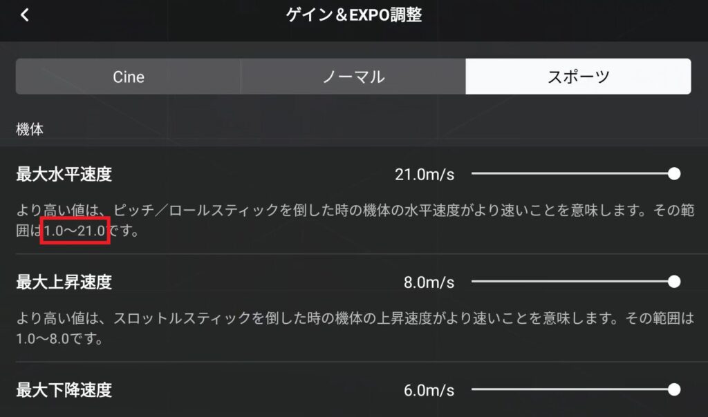 ここで注目したいのが、赤枠で囲われた数値の範囲です。最大水平速度の上限値について、ノーマルモードでは15.0m/s、スポーツモードでは21.0m/sとなっています。