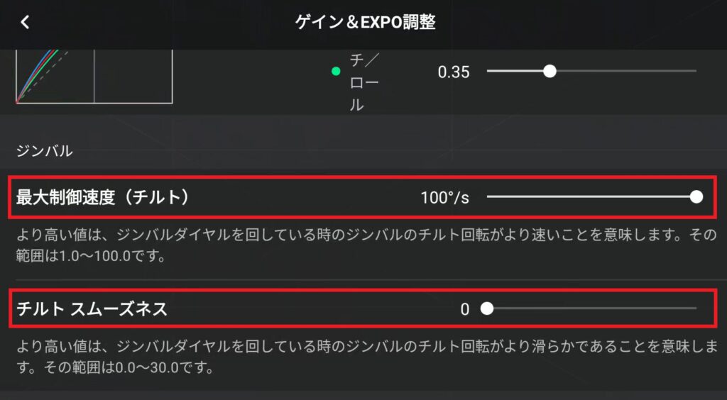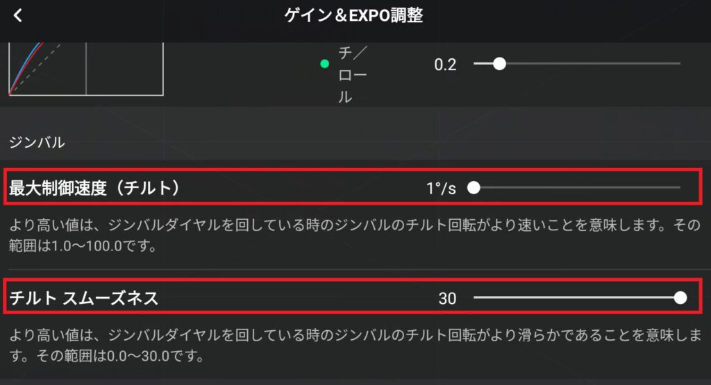 ちなみに私はSモードで、このジンバル操作に関するゲイン設定を以下のように変更しています。