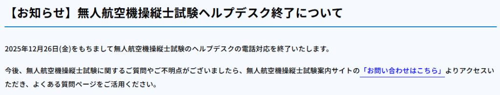 既にご存じの方もいらっしゃるかもしれませんが、2025年12月26日をもって「無人航空機操縦士試験ヘルプデスク」の電話対応が終了となりました。